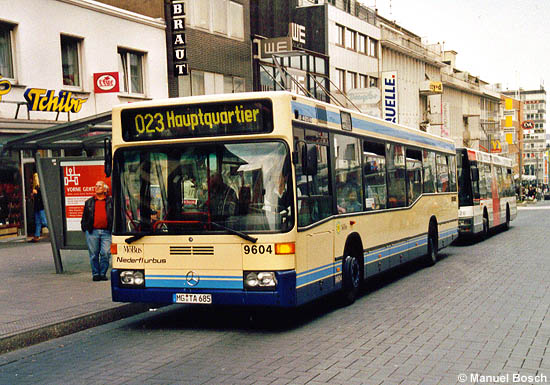 Im Rahmen der Neugestaltung der Fußgängerzone Hindenburgstraße in der Innenstadt von Mönchengladbach wurde auch die Haltestelle Abteiberg neu angelegt. Am 13.04.2004 verlässt der EvoBus MB O 405 N2 mit der Nummer 9604 der NVV AG die Haltestelle stadtauswärts.