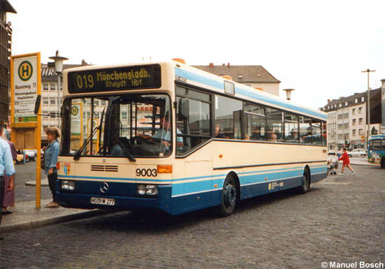 Im Sommer 1995 zeigte sich die Haltestellenanlage am Hauptbahnhof in Mönchengladbach noch in ihrem ursprünglichen Erscheinungsbild, als der Mercedes-Benz O 405 mit der Wagen-nummer 9003 der Stadtwerke Mönchengladbach auf seine Abfahrt als Linie 019 wartete.