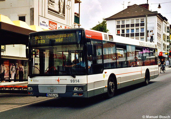 In der Nebenverkehrszeit werden die Linien 003 und 033 der NVV in Mönchengladbach teilwei-se mit am Hauptbahnhof übergehenden Fahrten bedient. Die entsprechende Angabe der Linien-anzeige zeigte der Wagen 9914, ein MAN A21 (NL 223), am 17.07.2004 an der Musical-Bühne.
