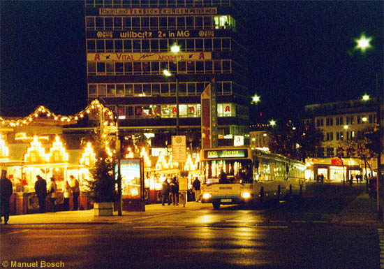 Mit dieser Aufnahme des Wagen 9605 der Mönchengladbacher NVV neben dem Weihnachts-markt an der Musical-Bühne vom 06.12.2003 wünschen wir unseren Leserinnen und Lesern