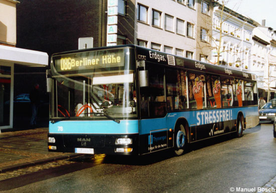 Insgesamt acht MAN A21 befinden sich im Bestand der Viersener niederrheinwerke. Der im Jahre 2000 in Dienst gestellte NL 223 mit der Wagennummer 78 konnte am 09.03.2005 im Einsatz auf der Linie 086 auf der Hauptstraße in der Viersener Innenstadt abgelichtet werden.