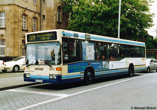 Sechs EvoBus MB O 405 N2 der Mönchengladbacher NVV wurden im zweiten Halbjahr 2004 mit einer Mehrbranchen-Bandenwerbung für verschiedene Unternehmen versehen. Dazu gehört der Wagen 9713, der am 17.05.2005 den Hauptbahnhof in Mönchengladbach erreicht.