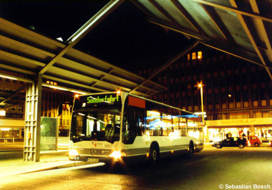 Auf einer Sonderlinie anlässlich der Kunstnacht "nachtaktiv" zeigt sich der NVV-Wagen 0507, ein EvoBus MB O 530 Ü (Citaro), am Abend des 05.11.2005 am Mönchengladbacher Haupt-bahnhof. Wir wünschen ein schönes Weihnachtsfest und alles Gute für das neue Jahr!