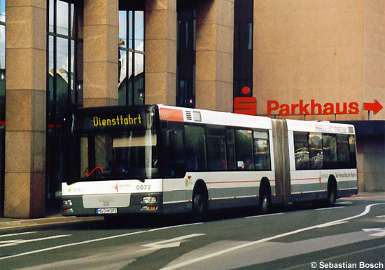 Vor der Kulisse des Sparkassen-Gebäudes befährt der Wagen 0072 der Mönchengladbacher NVV, einer von 18 im Jahre 2000 in Dienst gestellten MAN A23 (NG 263), am 09.10.2004