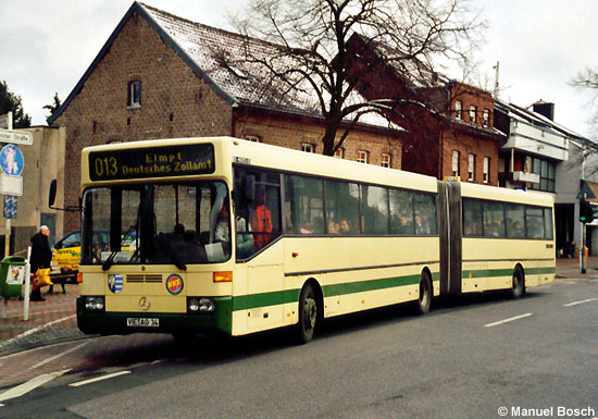 Mit einem Schülerkurs der Linie 013 erreicht die KVS aus Schwalmtal als Subunternehmer der NVV auch Mönchengladbacher Stadtgebiet. Die nachmittägliche Fahrt ab Hardt - zu sehen in Hardt Markt - bedient am 01.03.2006 der auf VIE-AG 34 zugelassene Mercedes-Benz O 405 G.