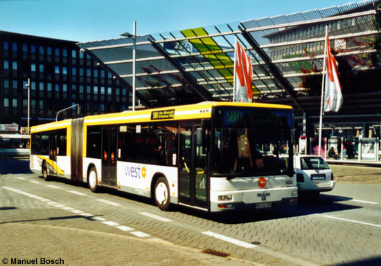 Seit Ende 2004 wird die Gemeinschaftslinie SB81 der west in Erkelenz und der NVV in Mön-chengladbach betrieben. Mit dieser Linie erreichen Fahrzeuge der west auch den Mönchen-gladbacher Hauptbahnhof, so der MAN A23 (NG 313) mit der Nummer 0222 am 29.08.2005.