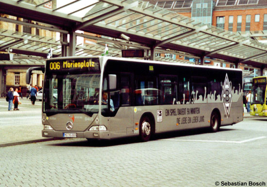 Die vier mit einer Vollwerbung für den Fußballverein Borussia Mönchengladbach versehenen EvoBus MB O 530 (Citaro) der NVV können zusätzlich mit Flaggen ausgestattet werden. So geschmückt verließ der Wagen 0405 am 09.08.2006 den Mönchengladbacher Hauptbahnhof.