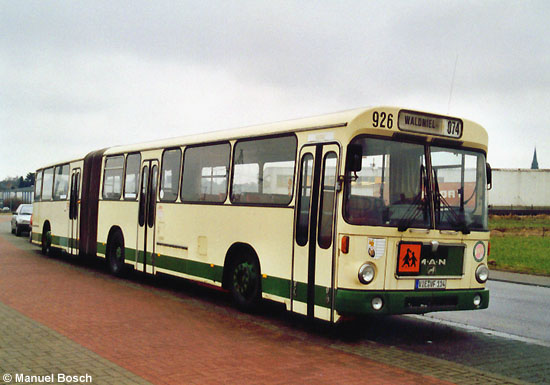 Dieser im Jahre 1981 gebaute MAN SG 220 Ü 16 mit dem Kennzeichen VIE-VF 114 befindet sich weiterhin im Bestand der Kraftverkehr Schwalmtal von der Forst GmbH & Co. KG. Am 21.02.2006 stand der Gelenkbus im Gewerbegebiet in Schwalmtal-Waldniel abgestellt.