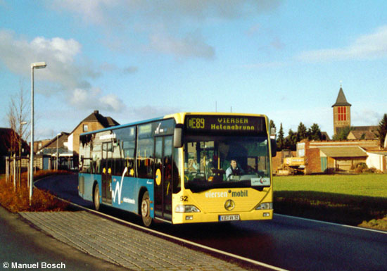 Vor der Kulisse des Viersener Stadtteils Hamm mit der Pfarrkirche St. Marien befährt der im Jahre 2004 an die Viersener niederrheinwerke gelieferte EvoBus MB O 530 (Citaro) mit der Nummer 52 am 26.12.2005 die Neuwerker Straße als Linie CE89 in Richtung Helenabrunn.
