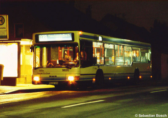 Der hellerleuchtete Fahrgastraum und die übrige Beleuchtung des Wagen 9820 der Mönchen-gladbacher NVV sowie die Wartehalle der Haltestelle Lockhütte strahlen ihr Licht in den kühlen Abend des 20.12.2005, als der MAN A10 (NL 222) auf seine Abfahrtszeit als Linie 033 wartet.