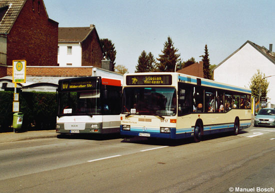 Am 06.05.2006 waren die Wagen 9717, ein EvoBus MB O 405 N2, und 0266, ein MAN A23 (NG 263), der NVV in Engelsholt auf dem Weg zum Stadion. In der nächsten Saison werden dort nach dem Abstieg von Borussia Mönchengladbach nurmehr Zweitligaspiele zu sehen sein.