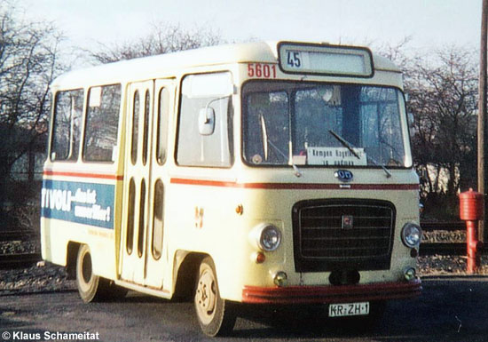 Im Jahre 1966 beschaffte die Krefelder Verkehrs-AG über die Büssing-Niederlassung drei nur sechs Meter lange OM/Borsani aus italienischer Fertigung. Klaus Schameitat traf den Wagen 5601 mit Zielschild "Kempen" im Dezember 1972 wenige Monate vor der Ausmusterung an.