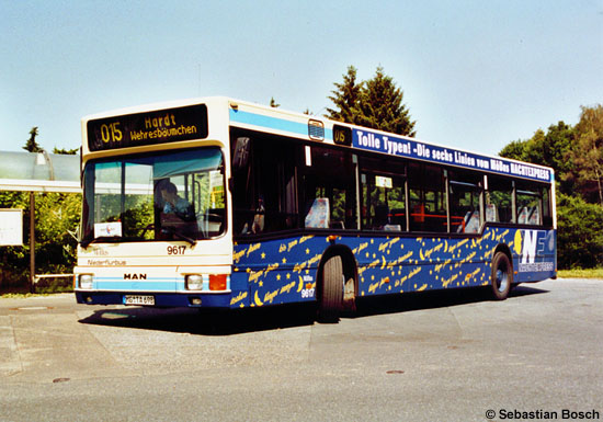 Seit genau zehn Jahren besteht das Mönchengladbacher NachtExpress-Netz mit sechs Linien. Als einer von drei entsprechend beklebten MAN A10 (NL 222) der NVV wurde der Wagen 9617 am 08.06.2006 an der Endstelle Donk Wendeplatz der Linie 015 im Bild festgehalten.