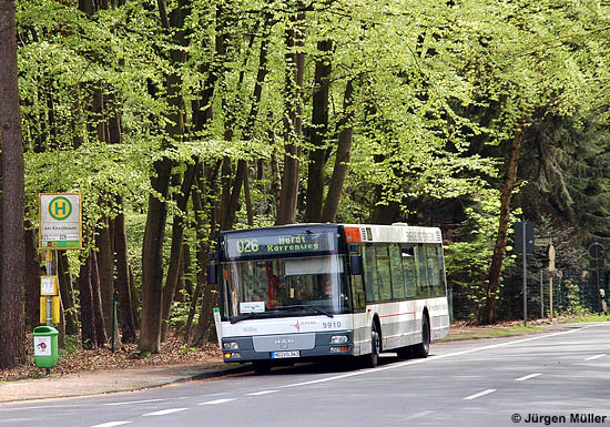 Im Hardterwald gelegen ist die Haltestelle Am Kirschbaum der Mönchengladbacher Linien 023 und 026. Jürgen Müller konnte dort am 27.04.2008 den MAN A21 (NL 223) mit der Wagennummer 9910 der NVV kurz vor Erreichen seines Fahrtzieles Hardt im Bild festhalten.