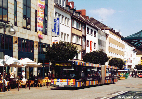 Sommerliche Atmosphäre am Marienplatz in Mönchengladbach-Rheydt: Der MAN A23 (NG 263) mit der Wagennummer 0061 der NVV passiert am 15.08.2008 soeben die örtliche Filiale der Buchhandlung, deren Vollwerbung der Gelenkbus seit sieben Jahren trägt.