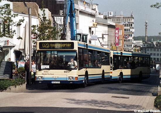 Noch rund ein Viertel aller Busse der Mönchengladbacher NVV tragen die alte beige/blaue Lackierung. Am 15.04.2009 bedienen mit dem als Wagen 9817 geführten MAN A10 (NL 222) und einem EvoBus MB O 405 N2 gleich zwei solcher Fahrzeuge die Haltestelle Abteiberg.
