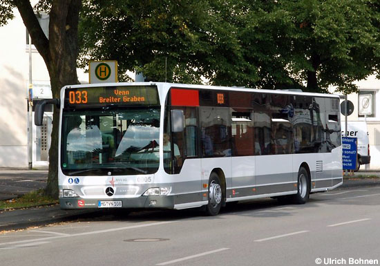 Seit dem 03.08.2009 werden die Neufahrzeuge der Mönchengladbacher NVV offiziell im Linien- dienst eingesetzt. Ulrich Bohnen lichtete an diesem Tag den EvoBus MB O 530 (Citaro) mit der Nummer 0905 an der Haltestelle Hensenweg ab, auffälligste Neuerung sind die LED-Anzeigen.