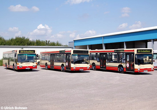 Die Firma Rath aus Viersen hat für Schulbusdienste drei weitere Niederflurbusse der NVV aus Mönchengladbach übernommen. Das Bild von Ulrich Bohnen zeigt den EvoBus MB O 405 N2 sowie die zwei MAN A10 (NL 222) mit den Kennzeichen VIE-EA 17 bis 19 auf dem Betriebshof.