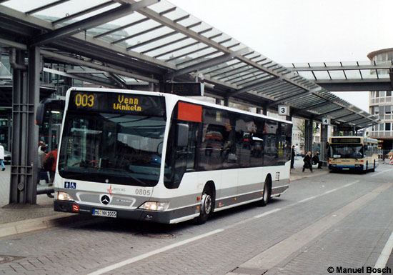 Der momentan jüngste und älteste Fahrzeugtyp im Bestand der NVV trafen sich am 16.04.2009 am Mönchengladbacher Hauptbahnhof: Vorne der EvoBus MB O 530 (Citaro) mit der Nummer 0805 aus dem Jahr 2008, dahinter ein EvoBus MB O 405 N2 des Baujahres 1997.