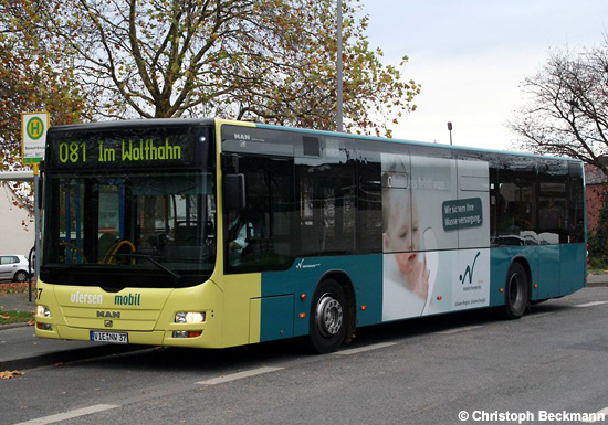 Unter dem Motto "Ohne uns fehlt was." steht die aktuelle Werbekampagne der Viersener niederrheinwerke. Den mit einem dieser Motive beklebten MAN A21 (NL 273 Lion's City) mit der Nummer 37 nahm Christoph Beckmann am 03.11.2009 an der Endstelle Bockert Kreuz auf.
