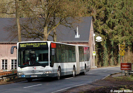 Zwischen Schwalmtal und Niederkrüchten liegt unmittelbar an der Schwalm die Lüttelforster Mühle. Im Bild von Jürgen Müller hat der EvoBus MB O 530 G (Citaro) mit der Nummer 0561 der Mönchengladbacher NVV am 27.02.2010 soeben die gleichnamige Haltestelle verlassen.