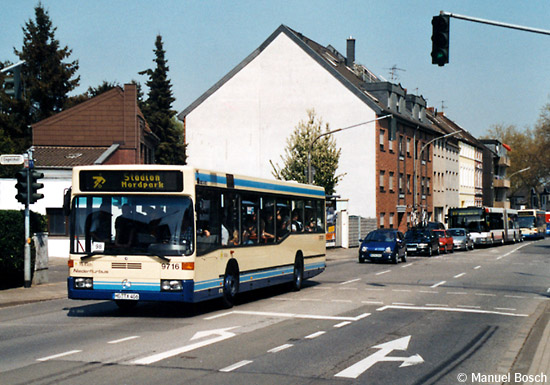 Drei Spiele der laufenden Weltmeisterschaft im Frauenfußball finden im Mönchengladbacher Nordpark statt. Der Anreise zum Stadion dient der inzwischen bewährte Shuttleverkehr der NVV, hier der EvoBus MB O 405 N2 mit der Nummer 9716 am 06.05.2006 auf der Bahnstraße.