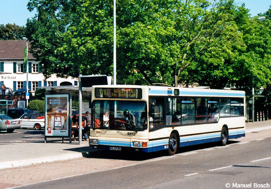 Im Süden von Mönchengladbach liegt der Stadtteil Wickrath, der bis 1975 eine eigenständige Gemeinde war. Die NVV erschließt Wickrath mit den Buslinien SB1, 006, 016 und 026. Am 03.06.2011 hatte der MAN A10 (NL 222) mit der Wagennummer 9813 sein Ziel als Linie 016 fast erreicht, als die Aufnahme an der Haltestelle Wickrath Markt entstand.