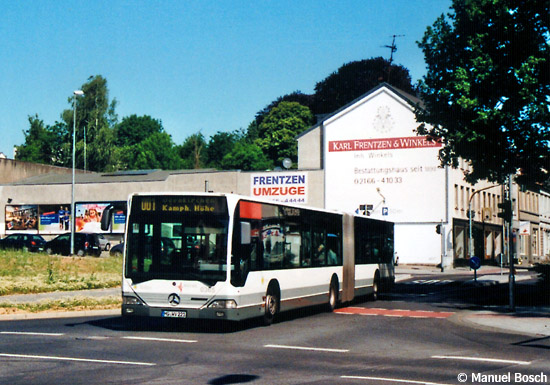 Seit dem Frühsommer fahren die Linien SB1, 001 und 002 in Mönchengladbach-Rheydt direkt durch die Friedrich-Ebert-Straße zum Marienplatz. Der EvoBus MB O 530 G (Citaro) mit der Wagennummer 0365 passiert am 03.06.2011 die neue Busspur in Richtung Marienplatz an der Kreuzung der Friedrich-Ebert-Straße mit der Mühlenstraße.