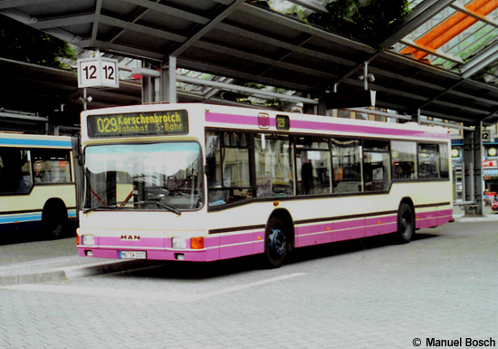 Einstmals erster Niederflurbus der zweiten Generation in Mönchengladbach, hatte die NVV den MAN A10 (NL 202) mit der Wagennummer 9301 im Sommer 2004 an die Firma Wallrath abge- geben. Nun wurde das Fahrzeug mit dem Kennzeichen MG-SW 2020 - hier am 01.06.2007 am Hauptbahnhof aufgenommen - auch bei Wallrath ausgemustert.