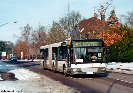 Eisige Temperaturen bestimmen die derzeitige Wetterlage am Niederrhein. Bei Minusgraden hielten sich auch am 04.01.2011 die Schneereste entlang der Viersener Straße, als der MAN A23 (NG 263) mit der Wagennummer 0064 der Mönchengladbacher NVV im Einsatz als Linie 019 nahe der Haltestelle Großheide stadteinwärts unterwegs war.