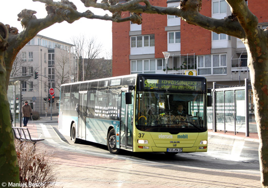Die grundlegende Modernisierung des Viersener Busbahnhofs am Rathausmarkt wurde bis zum Ende des Jahres 2011 abgeschlossen. Im angrenzenden Rathauspark trugen die Platanen ihr kahles Winterkleid, als dort am 30.12.2011 der MAN A21 (NL 273 Lion's City) mit der Wagen- nummer 37 der NEW Viersen zur Abfahrt als Linie SB87 bereitstand.