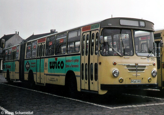 Zum Ersatz der Straßenbahn zwischen Mönchengladbach und Rheydt beschafften die damali- gen Stadtwerke Mönchengladbach in den Jahren 1967 und 1968 insgesamt zwölf Gelenkbusse mit Büssing-Fahrgestell und Emmelmann-Aufbau. Den Wagen 312 konnte Klaus Schameitat im März 1974 aufnehmen, die gesamte Serie stand noch bis 1981 im Einsatz.