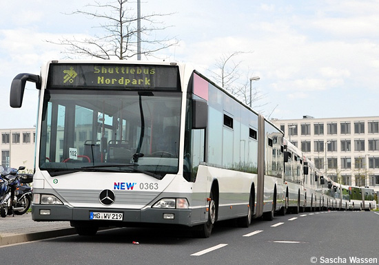 Der Fußball-Bundesligist Borussia Mönchengladbach hat soeben die erfolgreichste Saison seit mehr als 15 Jahren beendet. Das letzte Heimspiel fand am 28.04.2012 im Nordpark statt. Der EvoBus MB O 530 G (Citaro) mit der Nummer 0363 der NEW wartete unterdessen mit weiteren Fahrzeugen auf den Abtransport nach Spielende, festgehalten von Sascha Wassen.