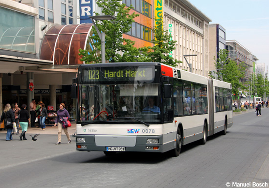 Die beiden im Herbst 2000 beschafften MAN A23 (NG 263) der NEW aus Mönchengladbach, die zunächst fünf Jahre lang täglich auf der Linie SB83 eingesetzt wurden, haben inzwischen eine Laufleistung von mehr als einer Million Kilometer erreicht. Als Verstärkerkurs der Linie 023 befährt der Wagen 0078 am 18.05.2012 die Hindenburgstraße in Richtung Alter Markt.