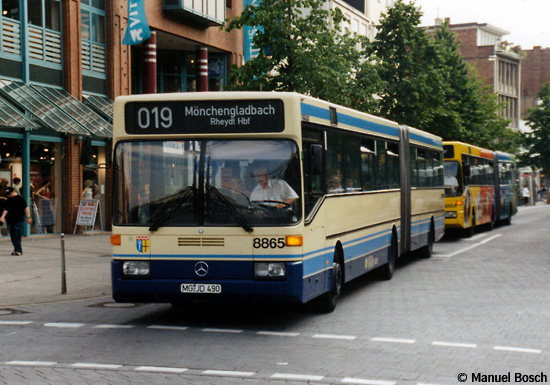 Vor nun zehn Jahren wurden bei der Mönchengladbacher NVV die Mercedes-Benz O 405 G des Baujahres 1988 ausgemustert. Wenige Wochen vor der Abstellung konnten am 21.06.2002 am Mönchengladbacher Hauptbahnhof mit den Wagen 8865 und 8864 nochmals zwei dieser insgesamt fünf Gelenkbusse in einem Bild festgehalten werden.