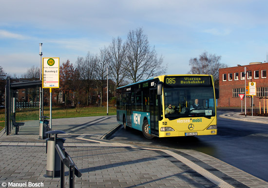 Der neue Busbahnhof im Viersener Stadtteil Dülken wurde Mitte Dezember in Betrieb genom- men. Die Anlage an der Melcherstiege am Rande des Ortskerns verfügt über vier Bussteige. Am 29.12.2012 war dort der EvoBus MB O 530 (Citaro) mit der Wagennummer 52 der NEW aus Viersen im Einsatz als Linie 085 anzutreffen.