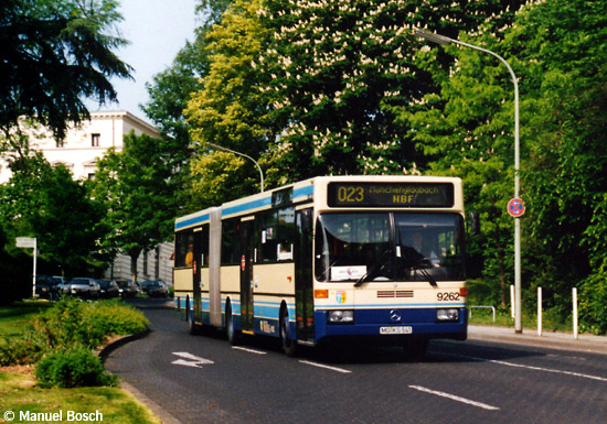 Vor zehn Jahren wurde der obere Abschnitt der Mönchengladbacher Hindenburgstraße saniert, so dass der Busverkehr über die parallele Abteistraße umgeleitet werden musste. Den Hans-Jonas-Park entlang rollte am frühsommerlichen 08.05.2003 der Mercedes-Benz O 405 G mit der Wagennummer 9262 der NVV bergab zur Stepgesstraße.