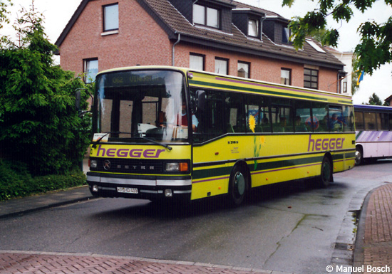 Vor zehn Jahren musste das Krefelder Busunternehmen Hegger Insolvenz anmelden und Ende Juni 2003 den Betrieb einstellen. Hegger war im Auftragsverkehr der SWK auch im Kreis Vier- sen anzutreffen. Wenige Wochen vor dem Betriebsende wurde der Setra S 215 SL mit der Zu- lassung KR-HD 400 am trüben 20.05.2003 in Grefrath am Bergerplatz aufgenommen.