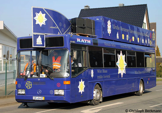 Bereits Anfang Februar erreicht die diesjährige Karnevalssession ihren Höhepunkt. Zur Mitfahrt in den Karnevalsumzügen hält das Viersener Busunternehmen Rath-Reisen zwei umgebaute ehemalige Linienbusse vor. Den ursprünglich in Mönchengladbach als Wagen 8702 eingesetz- ten Mercedes-Benz O 405 nahm Christoph Beckmann im Karneval 2015 auf.