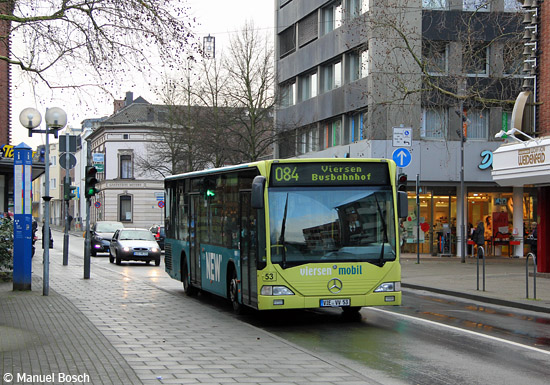 Von den einst sechs EvoBus MB O 530 (Citaro) mit Euro III-Motoren sind bei der Viersener NEW inzwischen nur noch drei im Bestand. Bereits ausgemustert ist der Wagen 53, der am 24.01.2014 auf der Lindenstraße unterwegs war. Der zeitgleich gelieferte Wagen 52 ist nun- mehr der letzte Viersener Bus mit der traditionellen Kennzeichenkombination VIE-VV.