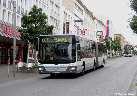 Seit dem 10.07.2016 befahren die Buslinien der Mönchengladbacher NEW die obere Hinden- burgstraße nicht mehr bergab in Richtung Hauptbahnhof. Am Morgen des 01.07.2016 war der MAN A23 (NG 313 Lion's City) mit der Wagennummer 0763 noch zwischen den Haltestellen Museum Abteiberg und Am Minto unterwegs.