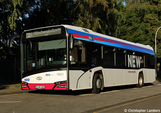 Seit Mitte August werden in Mönchengladbach und Viersen die neuen Solaris Urbino im Linien- dienst eingesetzt. In der Abendsonne des 17.08.2016 konnte Christopher Lambers den bei der NEW Mönchengladbach als Wagen 1601 eingereihten Solaris Urbino 12 an der Haltestelle Nellessenweg im Bild festhalten.