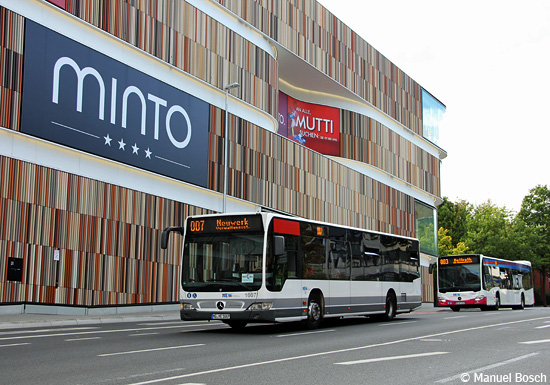 Seit Juli fahren die Linienbusse in Mönchengladbach in Richtung Hauptbahnhof nicht mehr über die obere Hindenburgstraße, sondern über Viersener Straße und Steinmetzstraße. Der EvoBus MB O 530 (Citaro) mit der Wagennummer 1007 der NEW erreicht am 29.09.2016 die auf der Rückseite des Einkaufszentrums Minto gelegene neue Haltestelle Kleiststraße (Am Minto).
