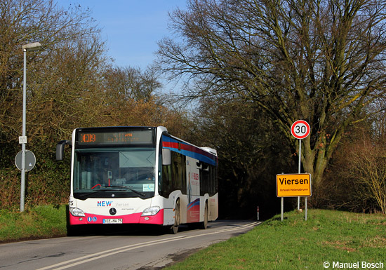 Helenabrunn ist der südlichste Ortsteil von Viersen und grenzt unmittelbar an das benachbarte Mönchengladbach. Den kleinen Kern des Ortsteils hat der EvoBus MB O 530 C2 (Citaro) mit der Nummer 75 der Viersener NEW soeben verlassen und strebt in der Wintersonne des 25.01.2016 auf der Helenenstraße nun seiner Endhaltestelle Wegweiser entgegen.