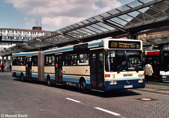 Vor nunmehr exakt 25 Jahren stellten die damaligen Stadtwerke Mönchengladbach ihre letzten Standard II-Omnibusse in Dienst. Neben 13 MAN SL 202 gelangten Anfang April 1992 auch nochmals sechs Mercedes-Benz O 405 G in den Bestand. Wagen 9262 aus dieser Serie konnte am 06.06.2001 am Mönchengladbacher Hauptbahnhof aufgenommen werden.