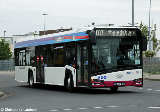 In den ersten August-Tagen gingen bei der Mönchengladbacher NEW die Neufahrzeuge der diesjährigen Beschaffung in Betrieb. Mit dem Wagen 1703 konnte Christopher Lambers am 02.08.2017 einen der insgesamt 16 neuen Solaris Urbino 12 am Nordpark aufnehmen. Darüber hinaus wurden vier Solaris Urbino 18 in den Bestand aufgenommen.