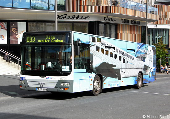 Von den diesjährigen Ausmusterungen der NEW Mönchengladbach sind auch die ersten Fahrzeuge des Jahrgangs 2007 betroffen. Dazu zählt der MAN A21 (NL 273 Lion's City) mit der Wagennummer 0701, der bis zuletzt mit einer auffälligen Vollwerbung für den Hugo-Junkers-Hangar versehen war und am 29.09.2016 noch vor dem Minto angetroffen werden konnte.