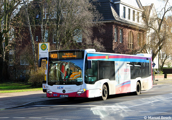 An Schultagen verkehrt mittags eine einzelne Fahrt der Viersener Linie CE89 bereits ab der Haltestelle Lochnerallee in Mönchengladbach statt ab der an der Stadtgrenze gelegenen Haltestelle Wegweiser. Am 25.01.2016 hat der EvoBus MB O 530 C2 (Citaro) mit der Wagennummer 75 der Viersener NEW soeben an der Lochnerallee eingesetzt.