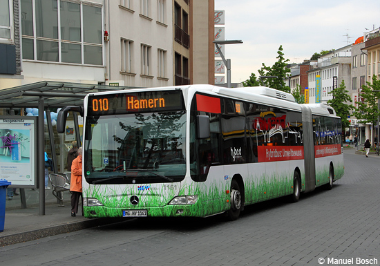 Nach gut siebeneinhalb Jahren Einsatzdauer hat die Mönchengladbacher NEW Ende März den EvoBus MB O 530 GDH (Citaro) mit der Wagennummer 1161 ausgemustert. Das auffällig beklebte Einzelstück - ein Gelenkbus mit seriellem Hybridantrieb - war noch im ersten Einsatzjahr, als das Bild am 18.05.2012 an der Haltestelle Stepgesstraße entstand.
