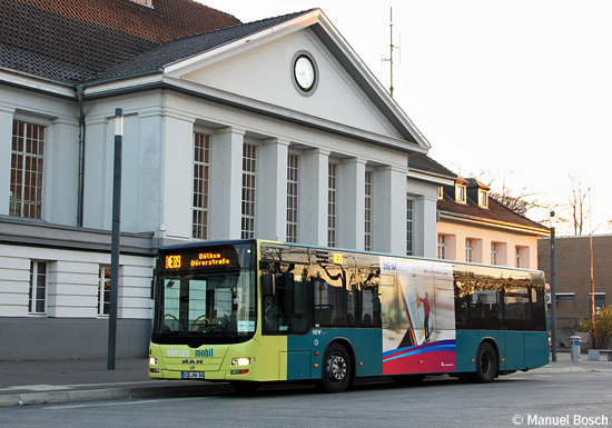 Selbst Mitte November reicht das Morgenlicht bereits aus, um sonntags die allererste Abfahrt im Viersener Stadtbusnetz fotografisch dokumentieren zu können. Am 18.11.2018 setzt der als Wagen 34 der Viersener NEW geführte MAN A21 (NL 283 Lion's City) aus dem Betriebshof kommend pünktlich um 8:23 am Viersener Bahnhof zur ersten Fahrt nach Dülken ein.
